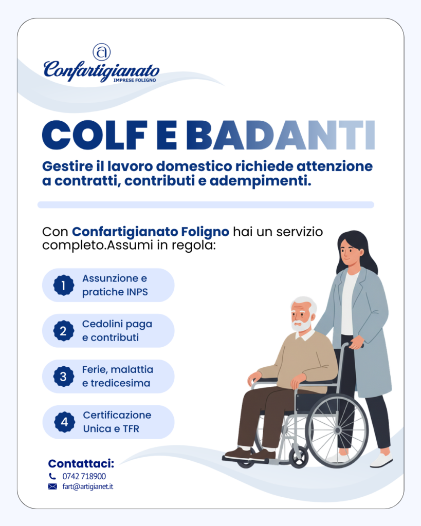 Per questo Confartigianato Imprese Foligno offre un servizio completo di assistenza per la gestione del lavoro domestico, pensato per semplificare ogni adempimento e garantire piena regolarità.
